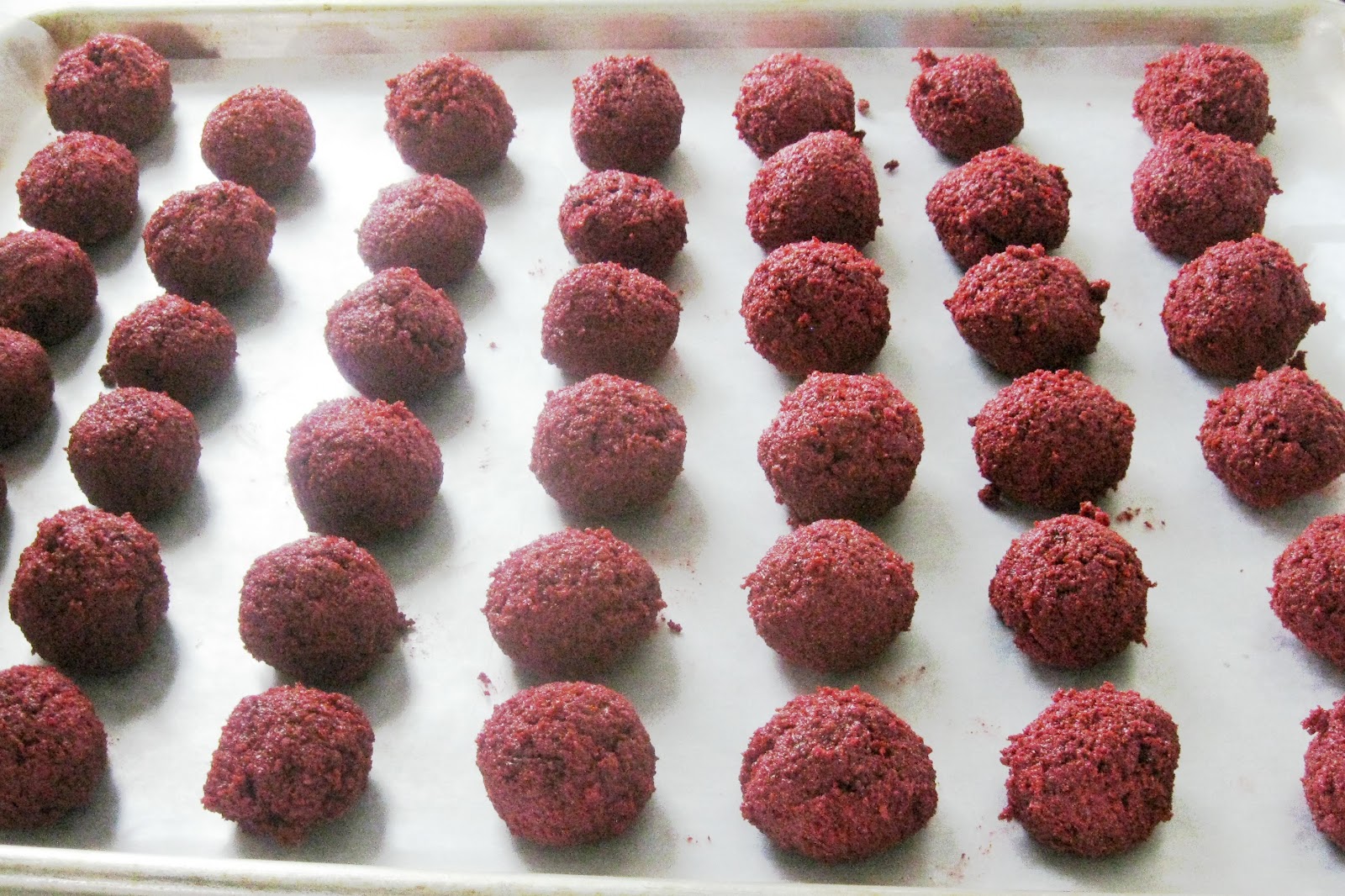 Using your hands or a small scoop, form balls out of the cake mix and place on a pan lined with waxed paper.