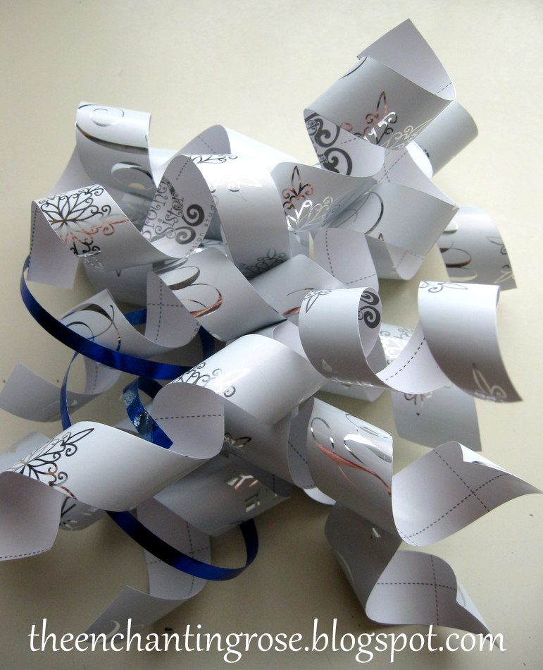 For the finishing touch I used some curly blue ribbon and silver flowers.
