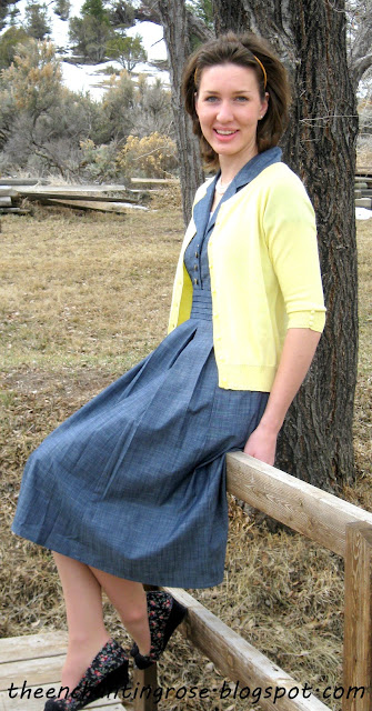 Wow! That dress looks perfect on you, really accentuating your waist. It's a great look on you! And the yellow sweater gives a nice splash of color. Beautiful!