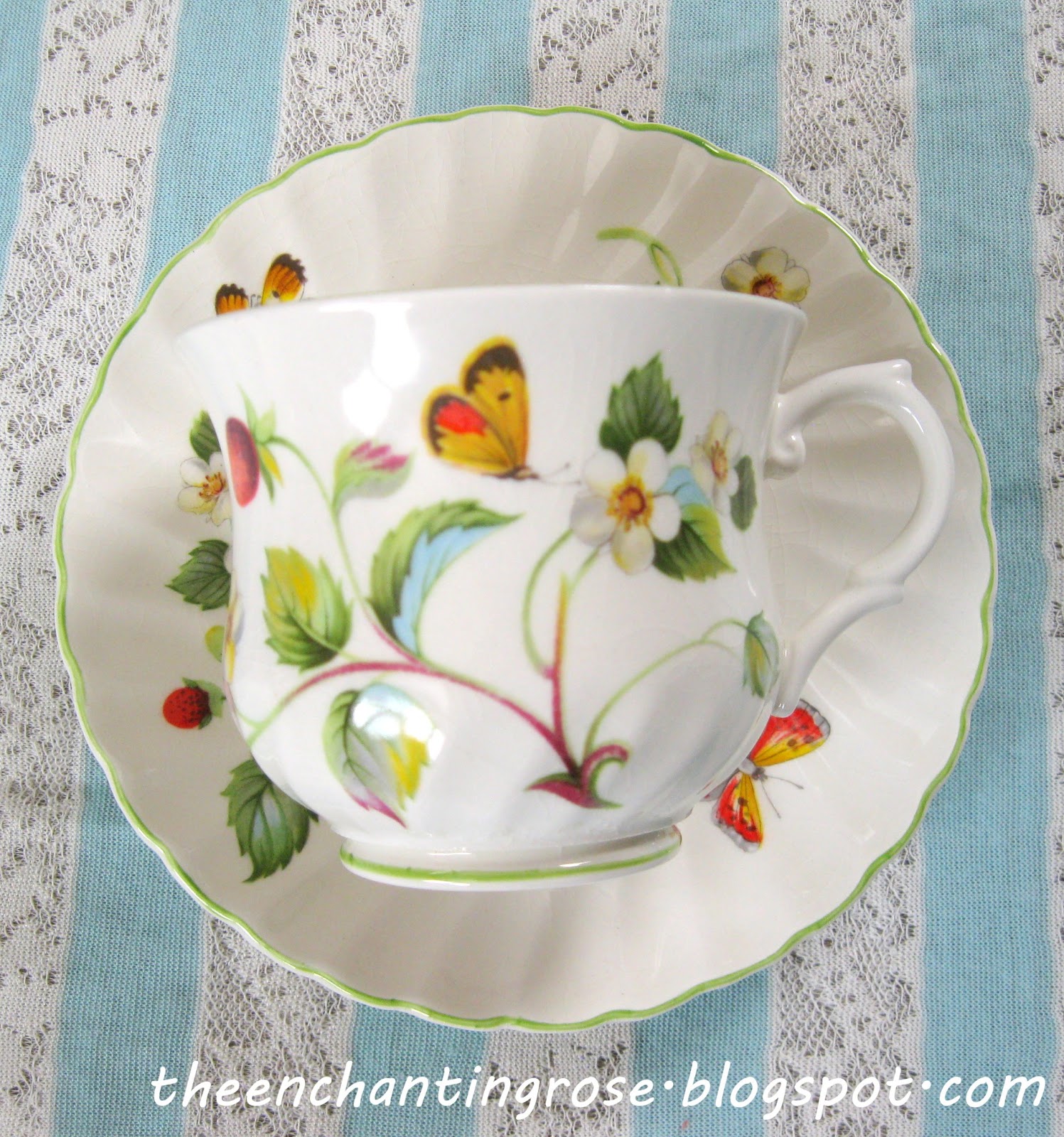 Oh my... Strawberries, butterflies, flowers... No wonder the teacups and pretty dishware had to follow you home! Good for you. Great finds and so pretty.