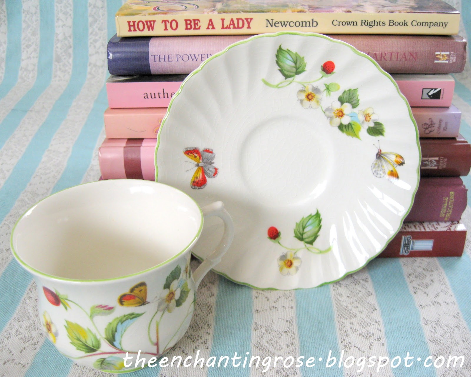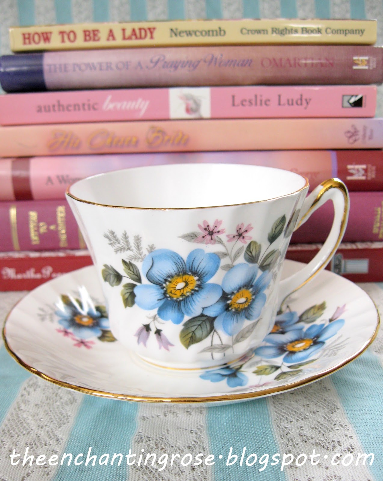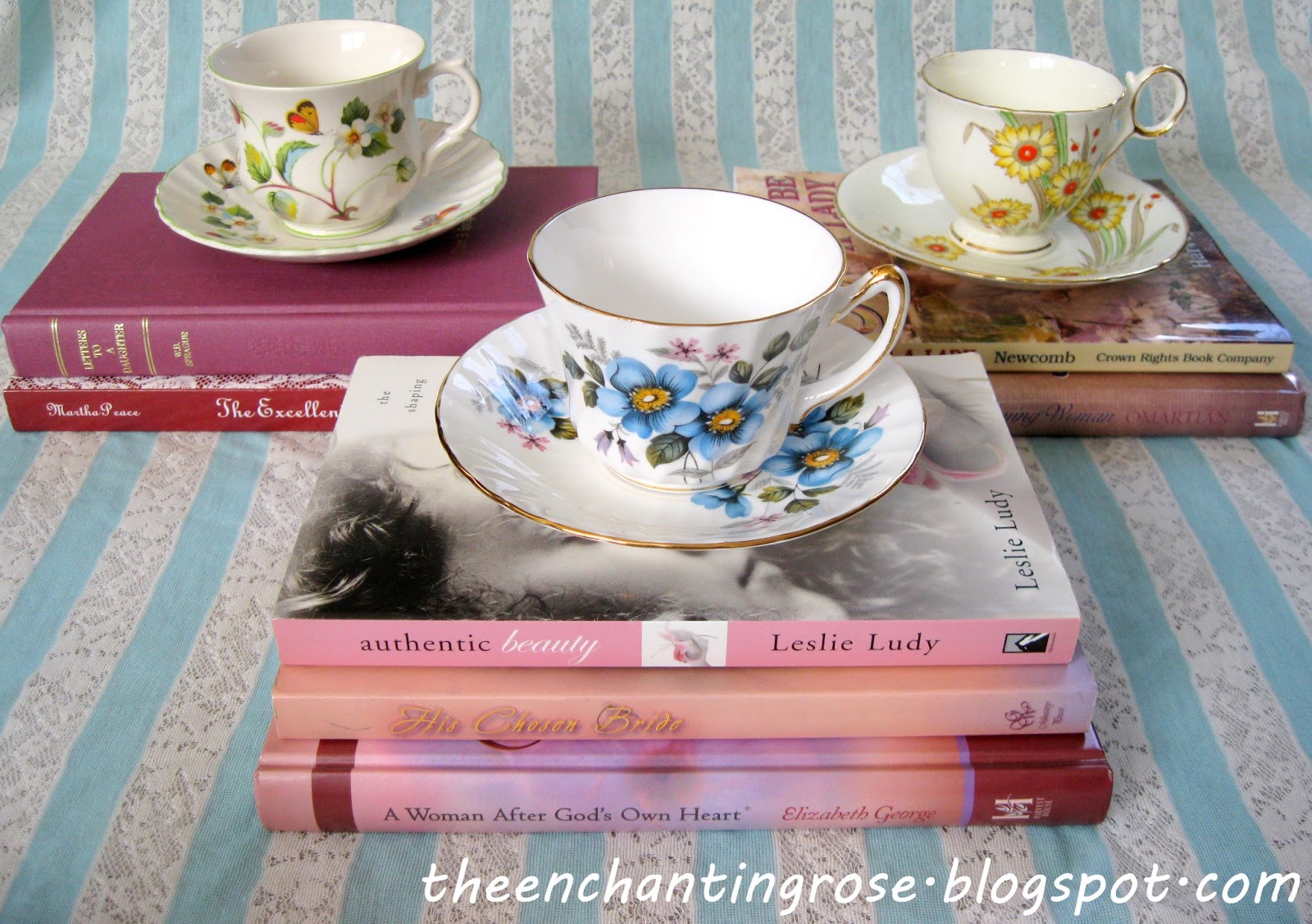 All so very dainty and beautiful! I must come for tea. So many memories as I see your beautiful stack of books.