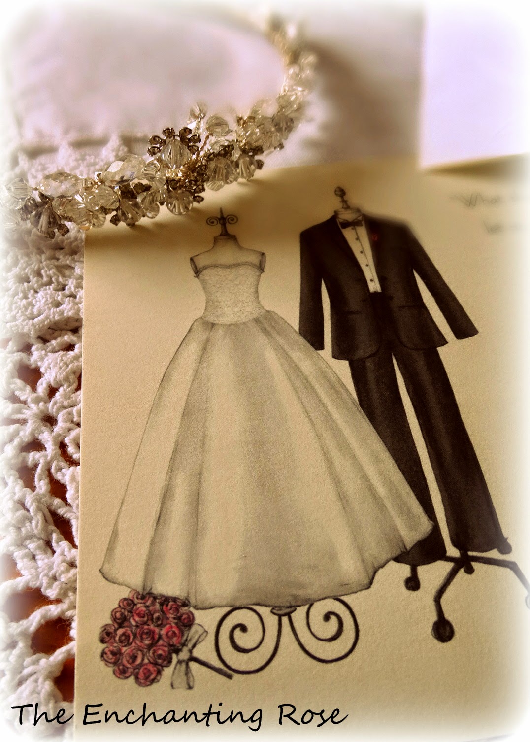 while wearing a delicate wedding dress, and holding a bouquet of 17 white roses.