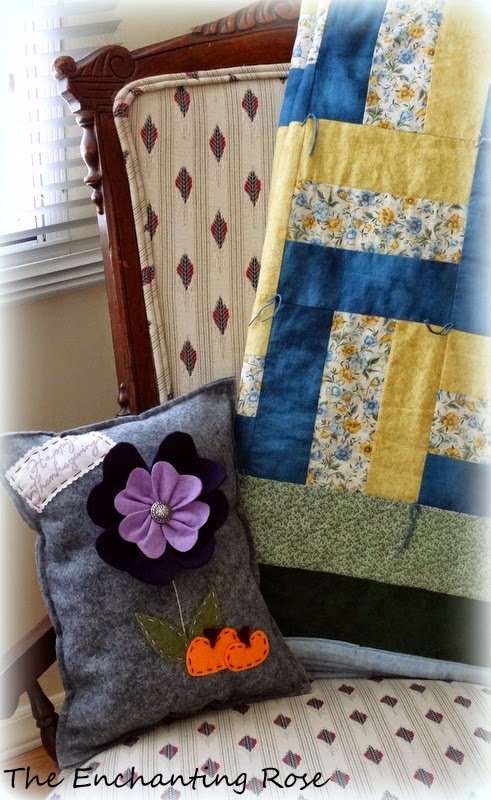 What a cute and sweet little pillow! And I do love that beautiful quilt hanging over the back of the chair. Mmmm.