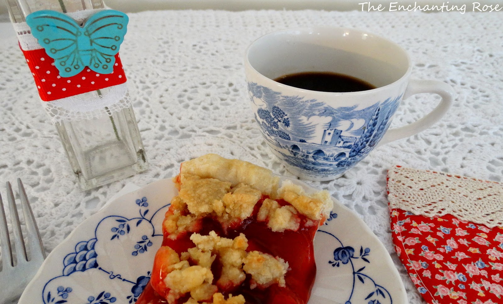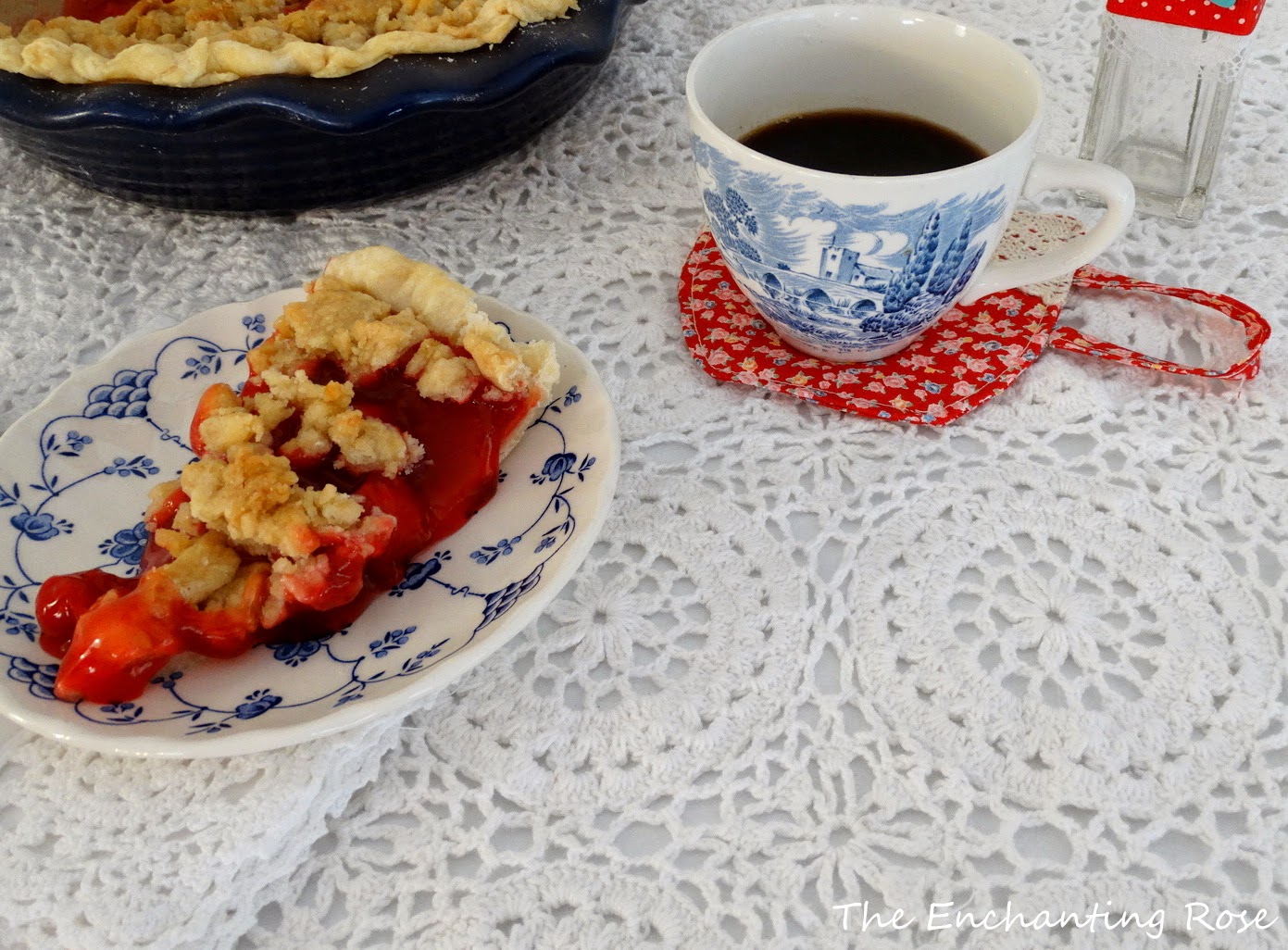 Stephanie, how did you know that cherry pie was my favorite? And how I would enjoy having coffee with you too. Your pie looks scrumptious, and the little coaster you made is sweet. You are always making something special for your home. I love the blue tea cup on here. Did I ever tell you that blue china is the prettiest to me?