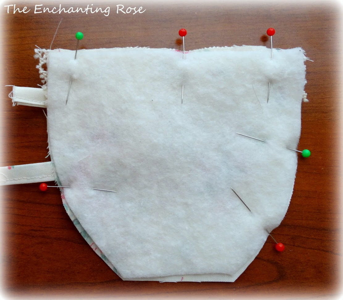 Then, lay the batting onto the fabric; pin into place.