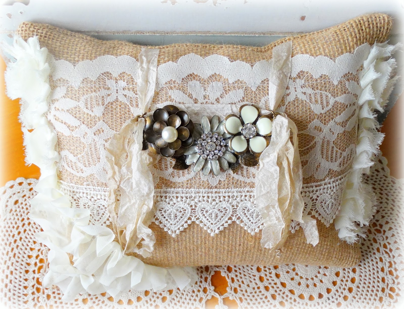 Stephanie, I love the way you use the vintage looking rose/jewelry in the first few pillows (are they vintage brooches?).